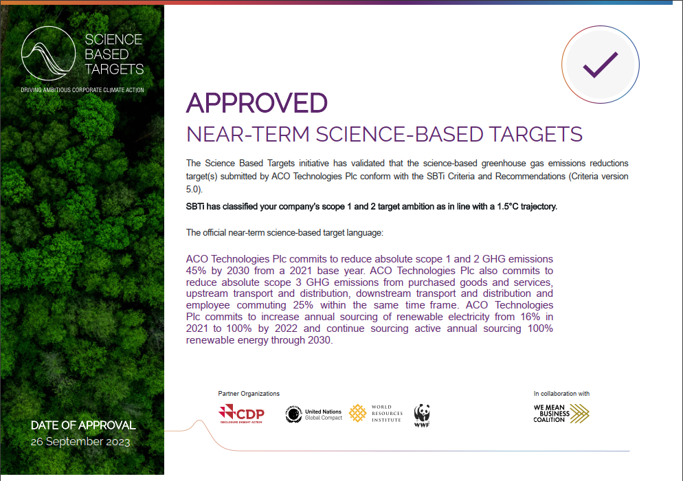 The Science Based Targets initiative (SBTi) have validated that the science-based greenhouse gas emissions reduction targets submitted by ACO Technologies plc conform with SBTi criteria and recommendation.